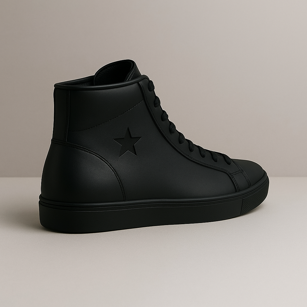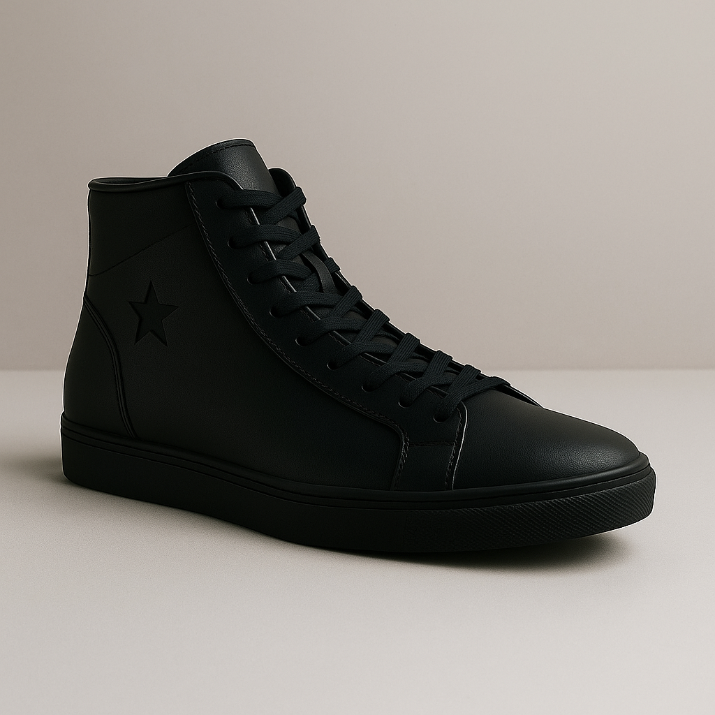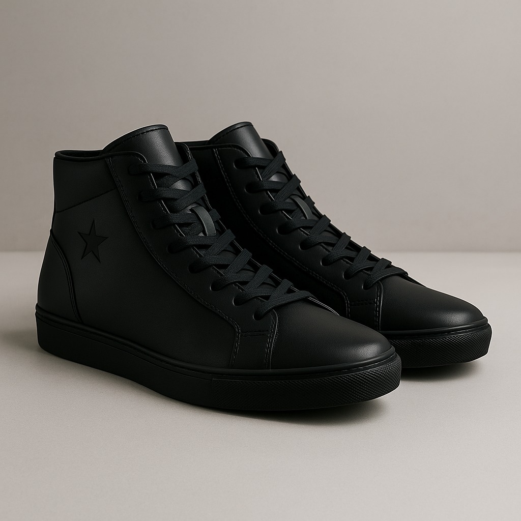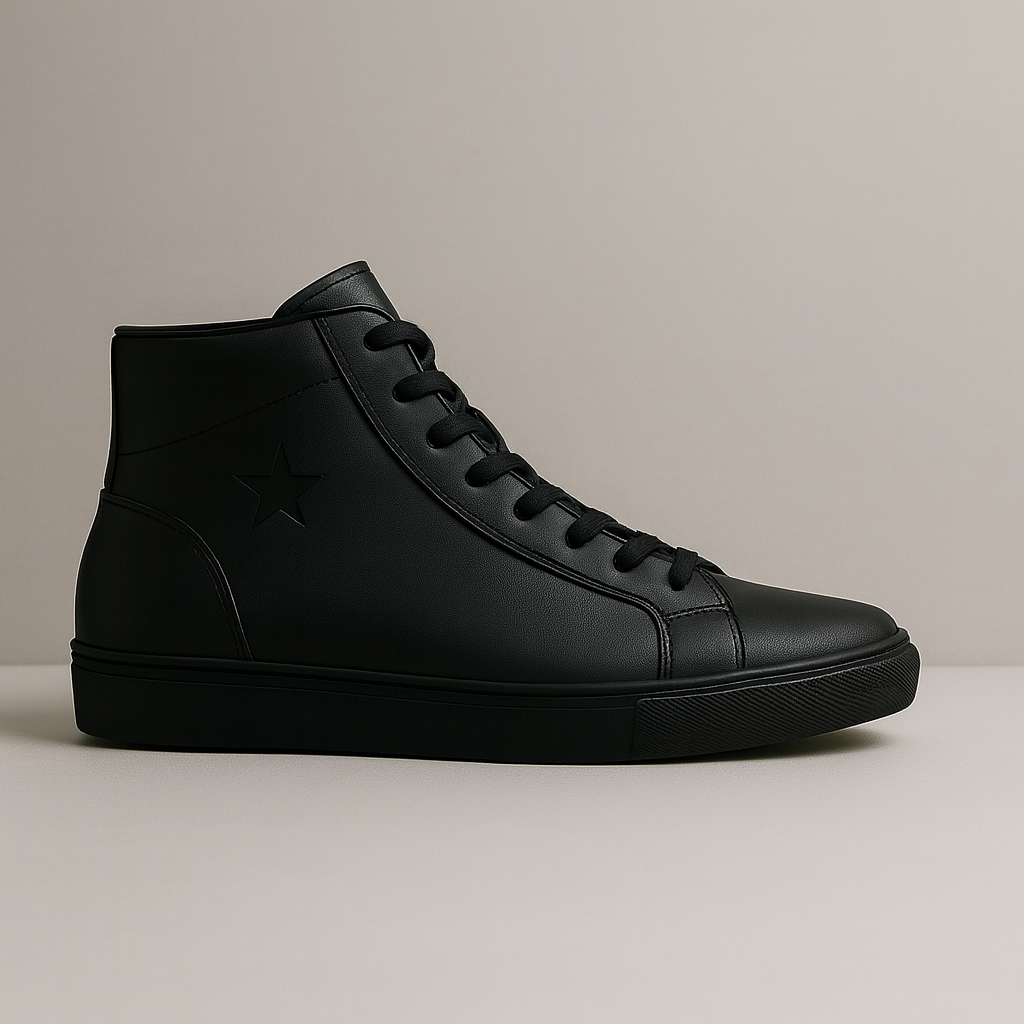 . Sleek, all-black vegan leather high-tops featuring a subtle debossed star detail. Your essential monochromatic sneaker.