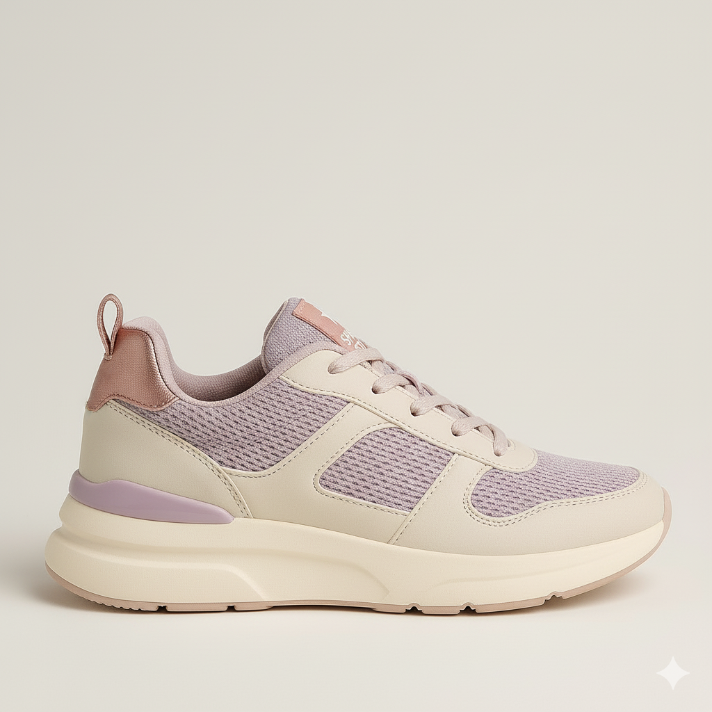 - Rose-Gold Detailing: Luxurious rose-gold accents on the heel and tongue tab elevate the design, providing a striking, metallic finish against the soft lilac and cream panels.
